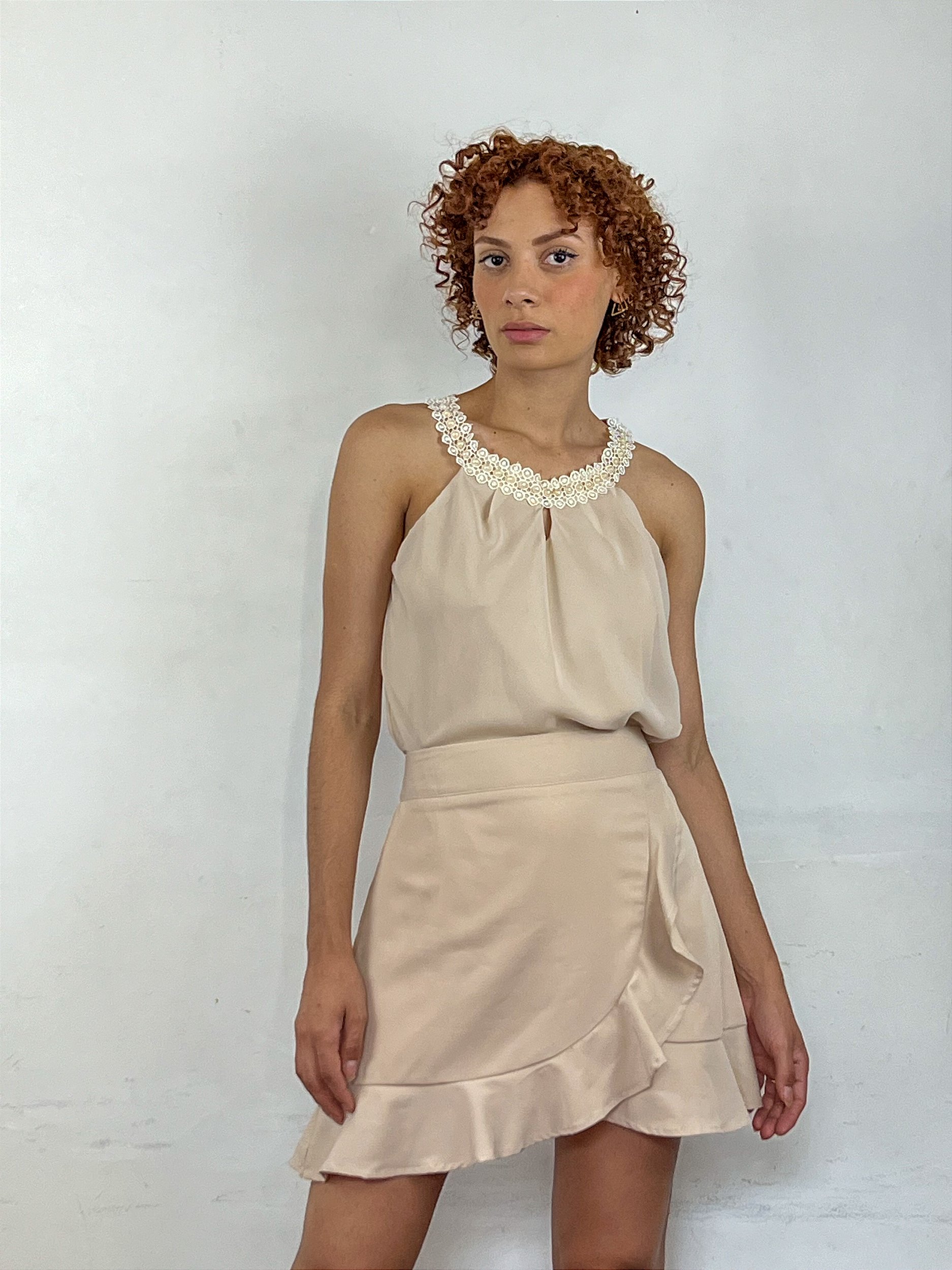 Saia em comprimento mini, jovial e delicada com babados transversal frontal. Feita em 100% poliester.