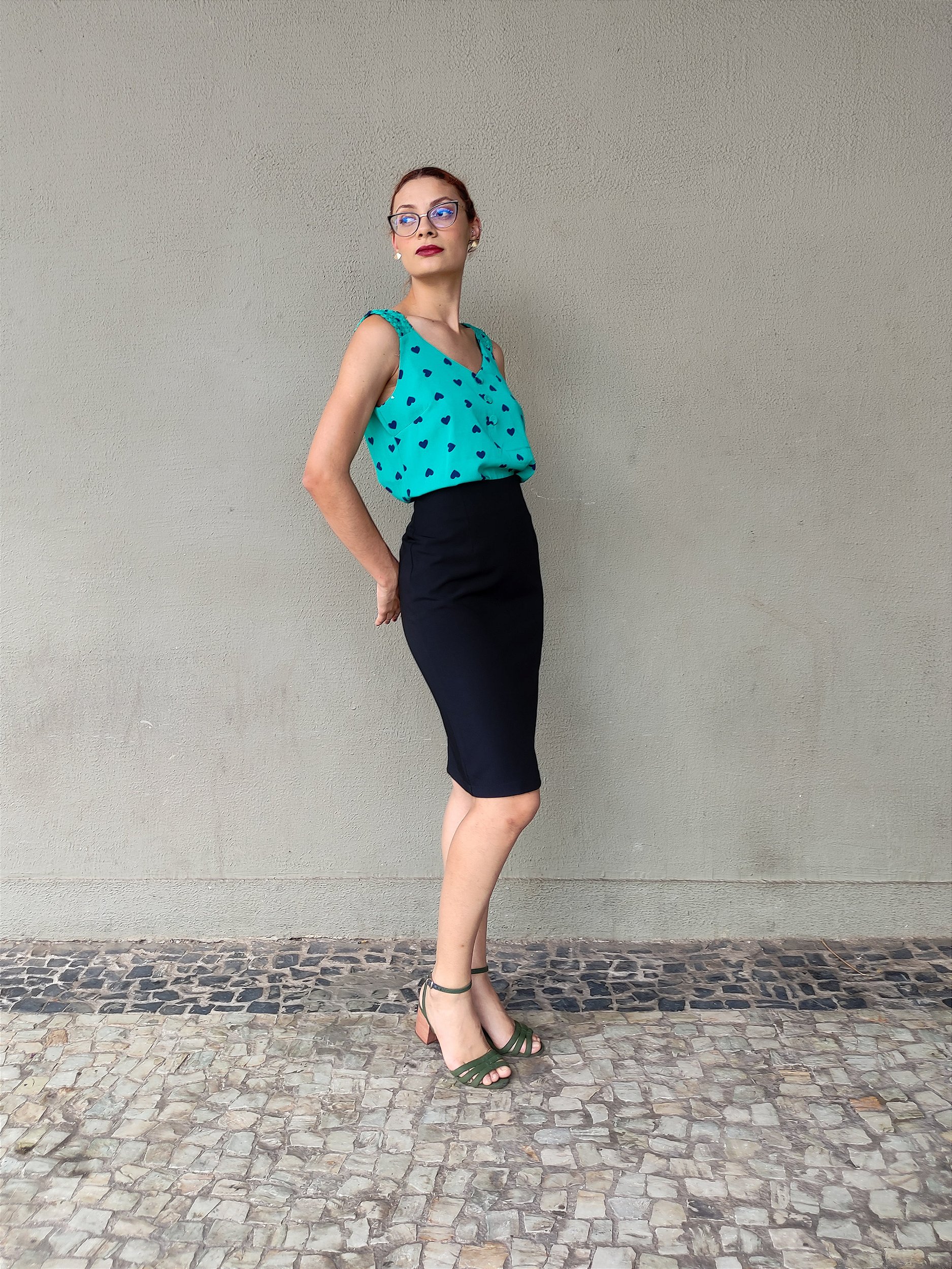 Saia lápis em 100% poliester, com fenda lateral , comprimento médio, com plissas que ajustam ao corpo na cintura.O fecho é na parte de tráz em um zíper embutido.